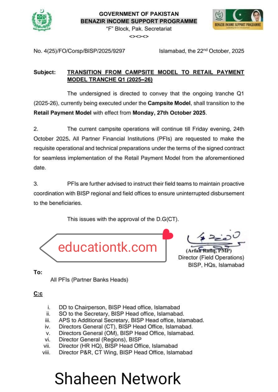 BISP Payment Model Transition: New Retail System Starts Oct 27 BISP Payment Model Transition: New Retail System Starts Oct 27 BISP Payment Model Transition: New Retail System Starts Oct 27 Big update for beneficiaries of the Government of Pakistan Benazir Income Support Programme (BISP). An official notification has been issued detailing a major change in …