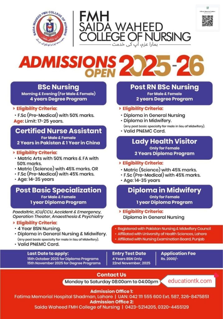 Are you aspiring to build a rewarding career in healthcare? The FMH Saida Waheed College of Nursing Admissions for 2025-26 are now officially open, presenting a golden opportunity for both male and female candidates across Pakistan. This is your chance to join one of Lahore’s most prestigious nursing institutions, affiliated with the esteemed Fatima Memorial Hospital.