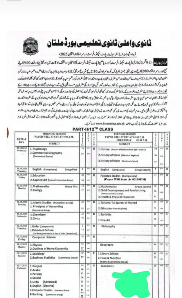 BISE Multan 12th Class (Part-II) Date Sheet 2025