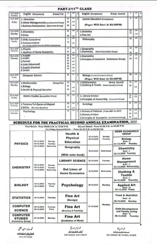 The annual examinations for the 12th class will commence on October 29, 2025. Papers are scheduled in two shifts: the Morning Session starting at 9:00 AM and the Evening Session starting at 2:30 PM.