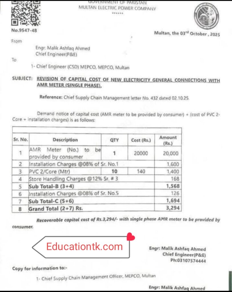 In a crucial update for prospective consumers, the **GOVERNMENT OF PAKISTAN** through the **Multan Electric Power Company (MEPCO)** has issued a revised structure for the **Capital Cost of New Electricity General Connections**. This change specifically targets connections featuring the mandatory **AMR Meter (Single Phase)**. This notification, dated 03rd October 2025, provides full transparency on the costs applicants must now bear.