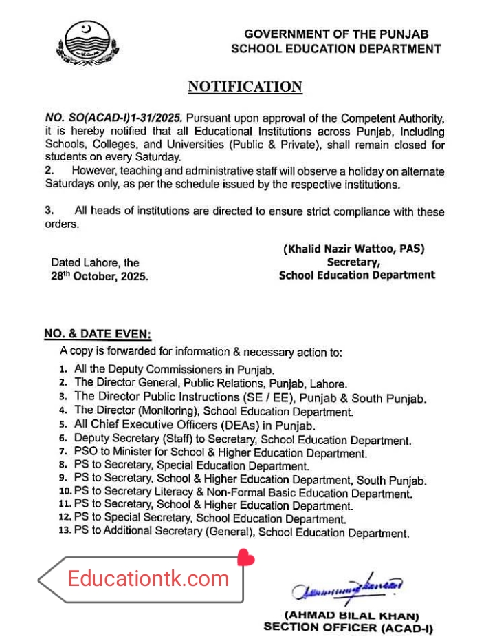 This information is based entirely on the **Official Notification No. SO(ACAD-I)1-31/2025**, dated Lahore, the 28th October, 2025, issued by the Secretary, School Education Department, Mr. Khalid Nazir Wattoo, PAS. This serves as the definitive source for the new **Punjab Saturday School Holiday** policy.